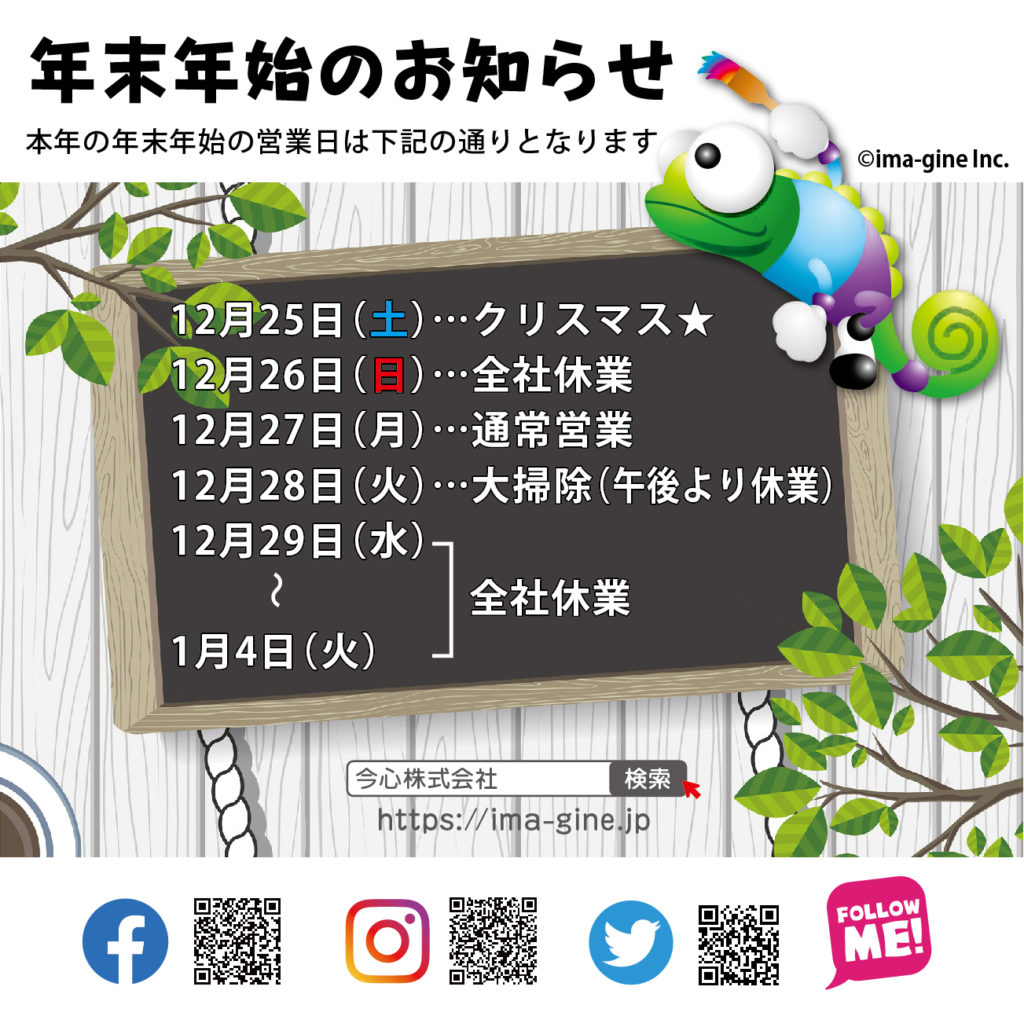 年末年始の営業日のお知らせ 平素は格別のお引き立てを賜り、厚く御礼申し上げます。 今心株式会社では
